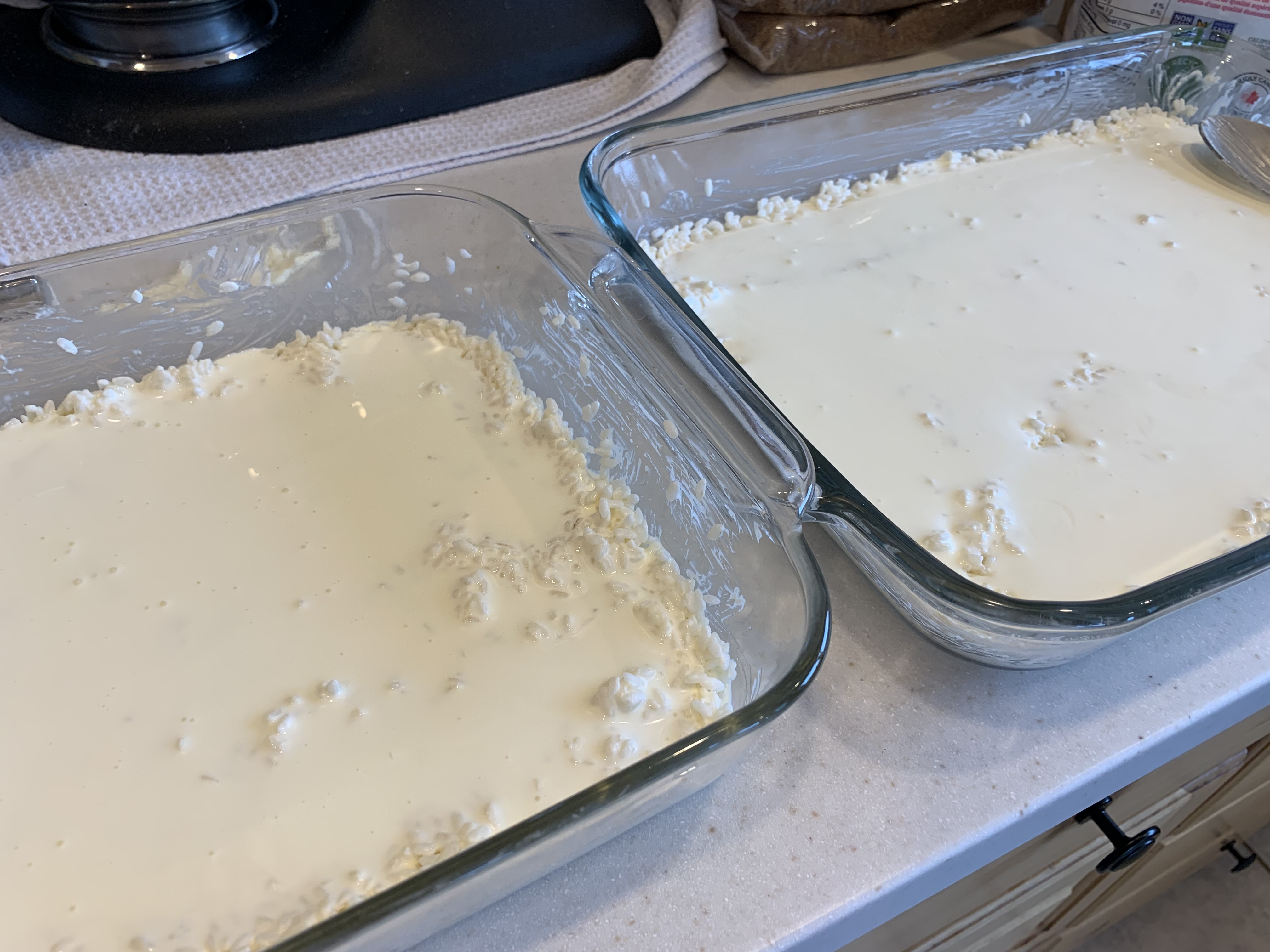 After soaking 1 hour, drain and rinse the rice. Divide into a 9 x 13 pan and 8 x 8 pan so there are even layers of rice on the bottom. I'll include amounts to add to both pans, to avoid confusion.